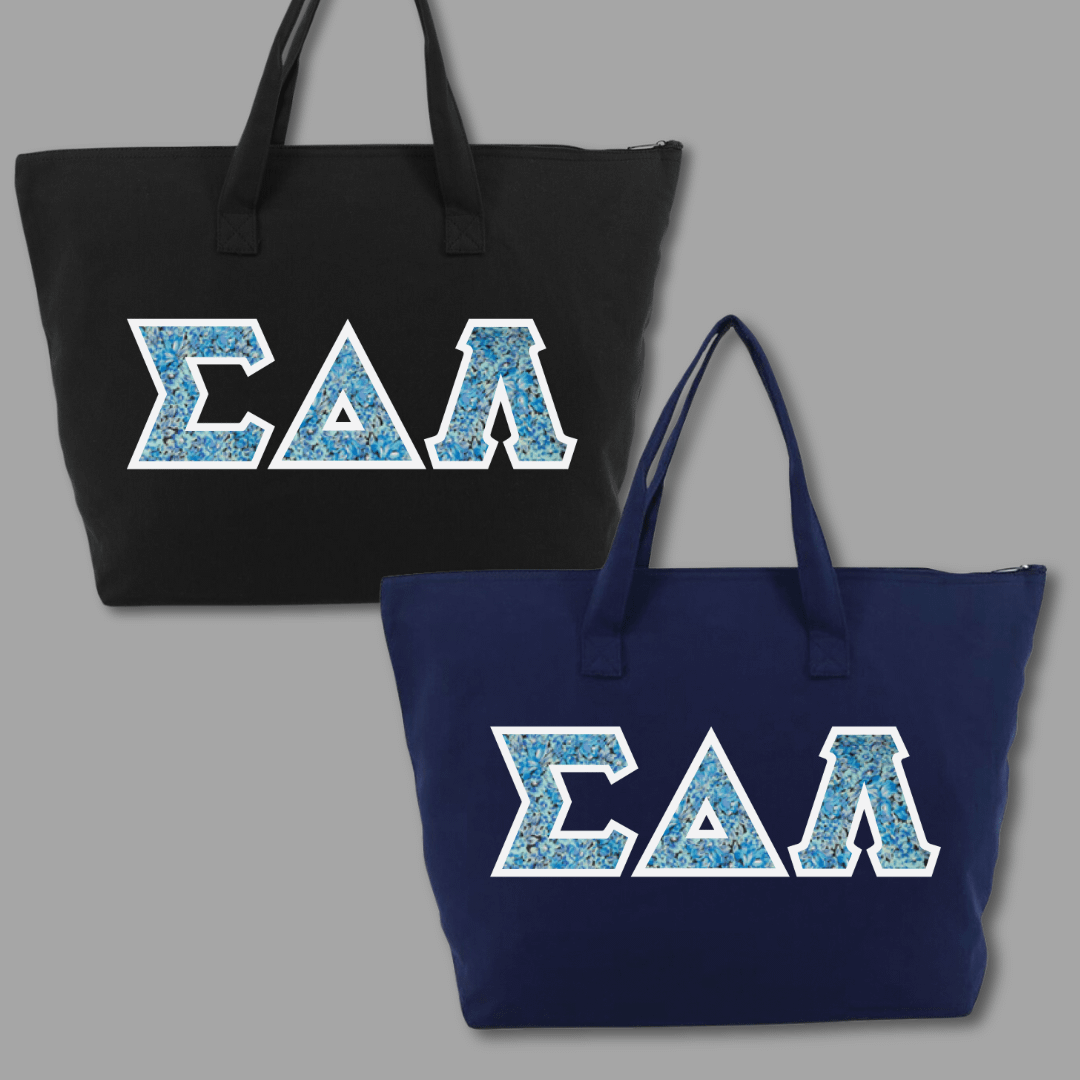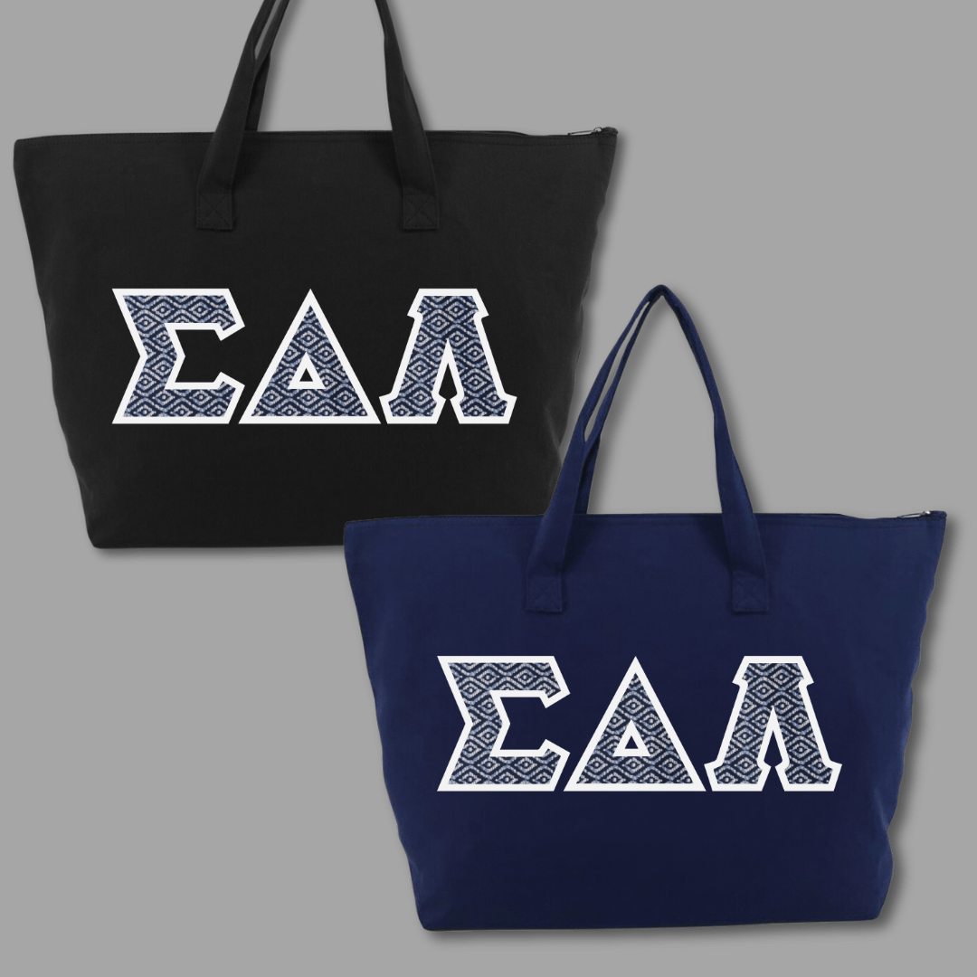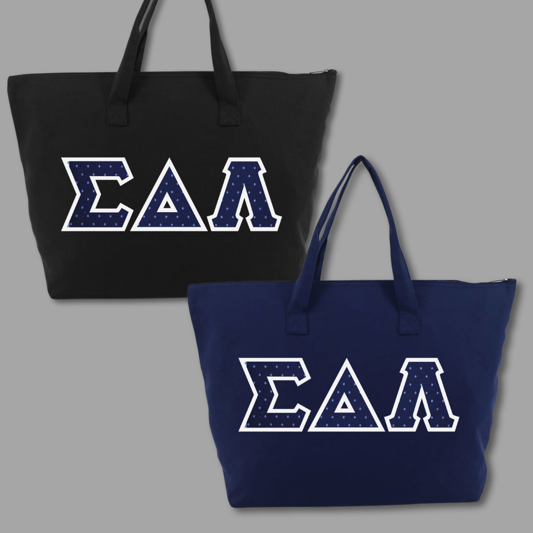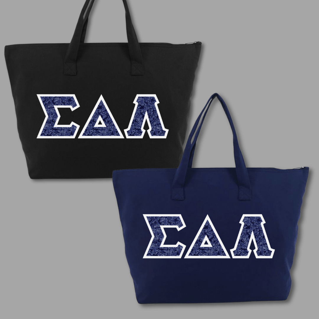 Our large tote bags make a statement while providing a generous carrying capacity of almost 1650 cubic inches. Measuring 22″ x 15″ x 5″, this 100% cotton gusseted tote also features a zipper closure and an interior zippered pocket. We embroider the same Greek stitch letters from our classic shirts onto the tote in the same large, 4.5″ size. Pick one of our custom SDL-inspired fabrics to create a tote bag that embodies your pride!