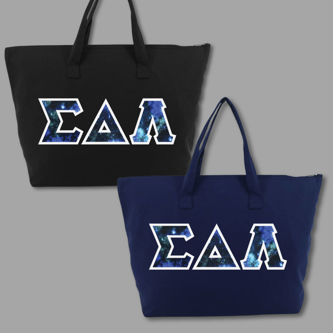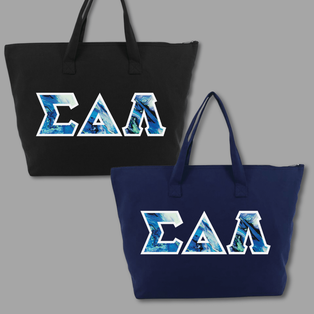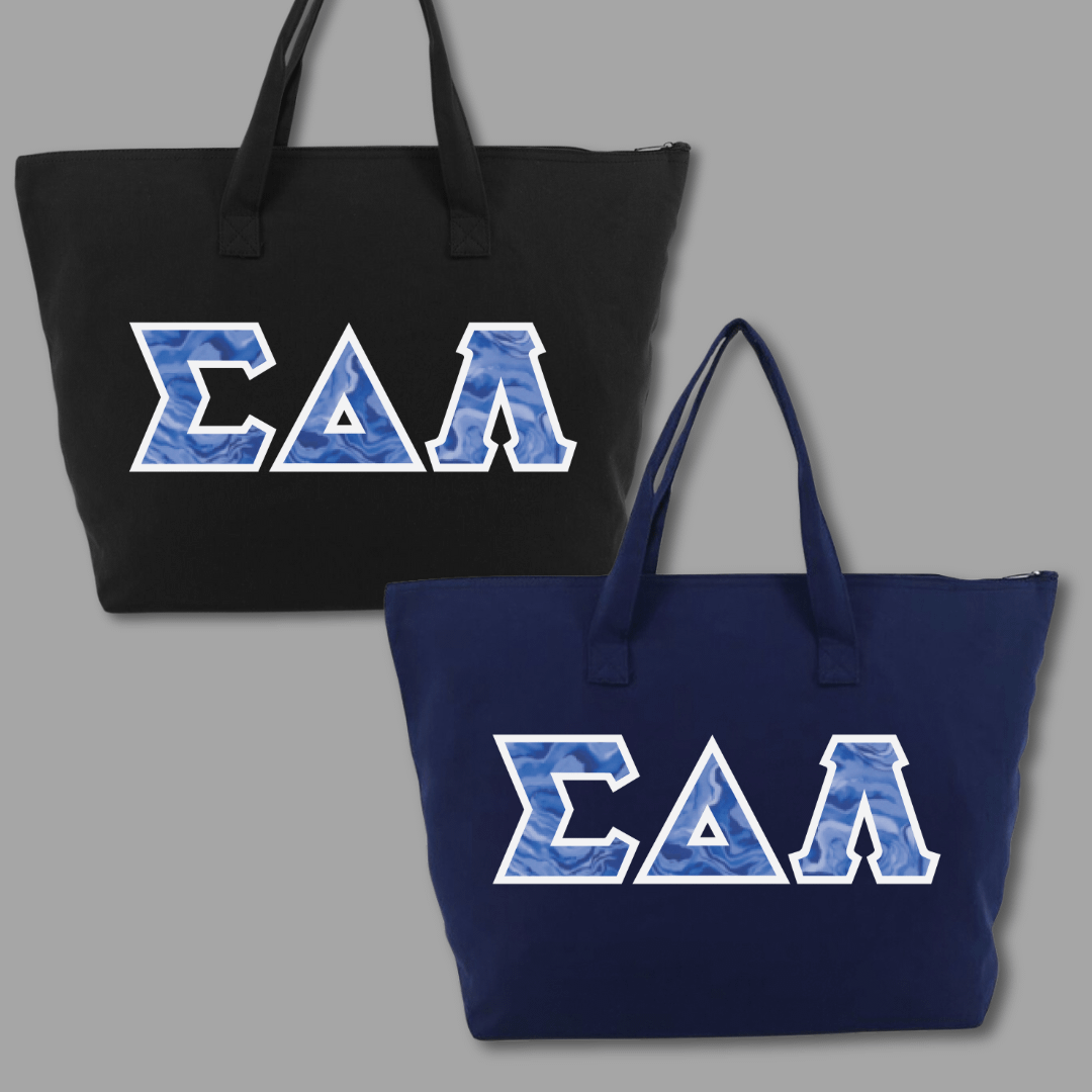 Our large tote bags make a statement while providing a generous carrying capacity of almost 1650 cubic inches. Measuring 22″ x 15″ x 5″, this 100% cotton gusseted tote also features a zipper closure and an interior zippered pocket. We embroider the same Greek stitch letters from our classic shirts onto the tote in the same large, 4.5″ size. Pick one of our custom SDL-inspired fabrics to create a tote bag that embodies your pride!