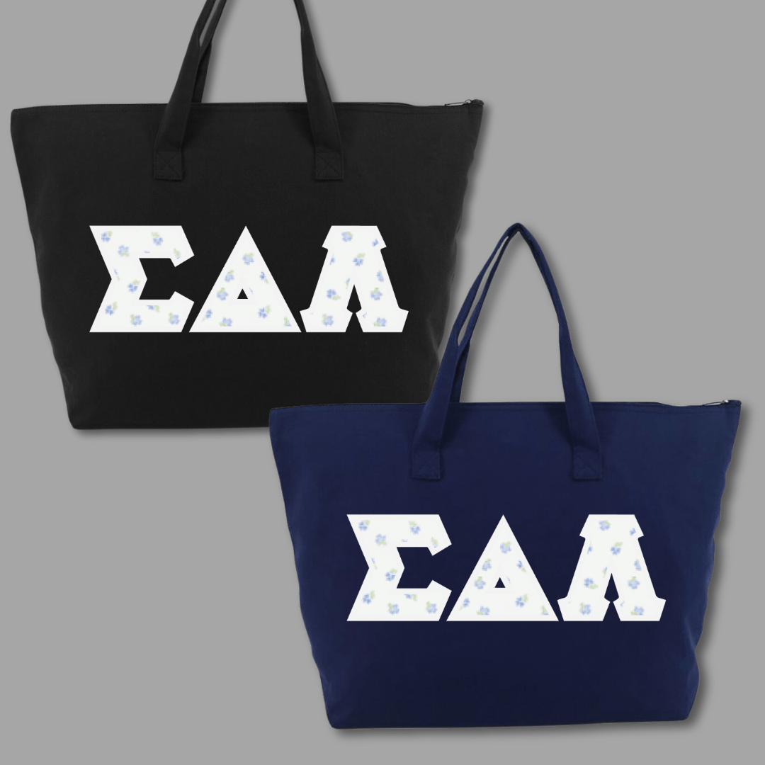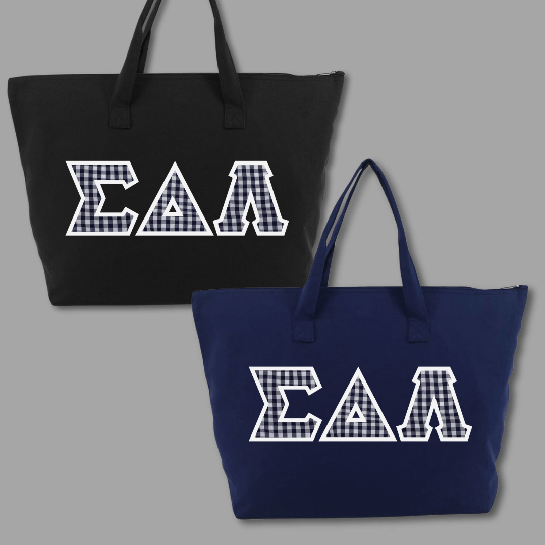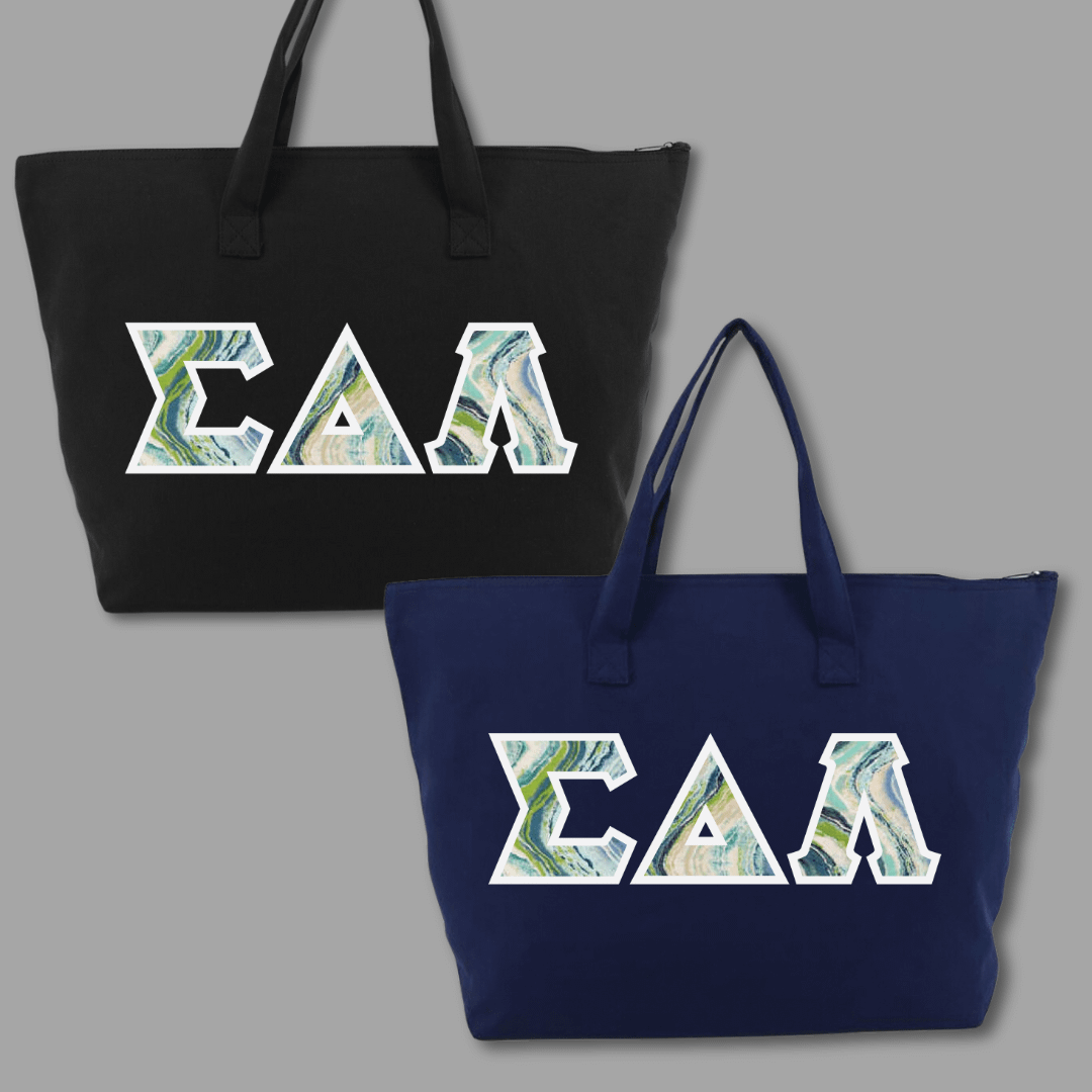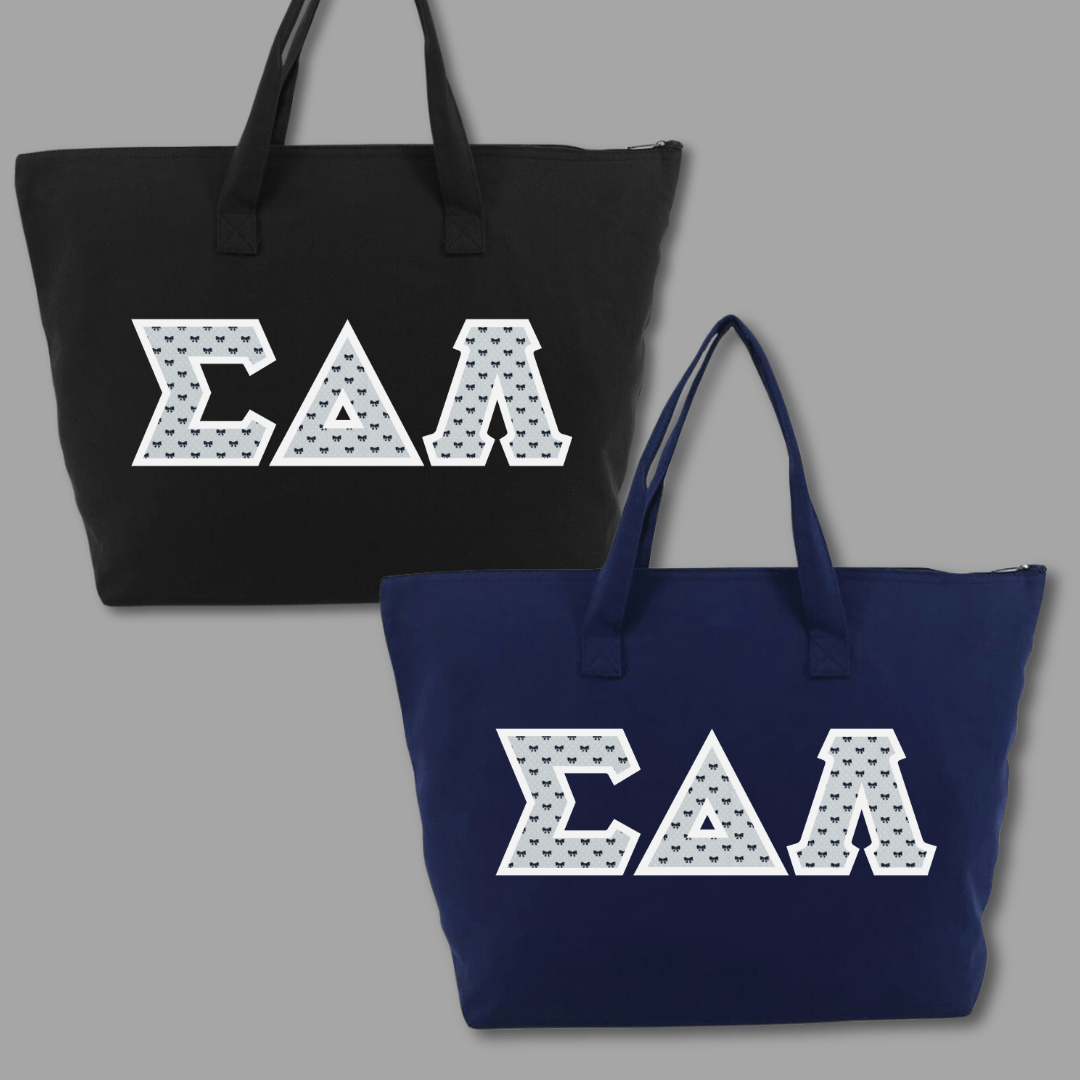 Our large tote bags make a statement while providing a generous carrying capacity of almost 1650 cubic inches. Measuring 22″ x 15″ x 5″, this 100% cotton gusseted tote also features a zipper closure and an interior zippered pocket. We embroider the same Greek stitch letters from our classic shirts onto the tote in the same large, 4.5″ size. Pick one of our custom SDL-inspired fabrics to create a tote bag that embodies your pride!